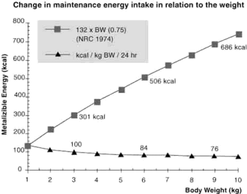 Small-sized adult dogs have basic energy requirements which are proportionately higher than large-sized dogs: a 3-kg Yorkshire needs about 100 kcal per kg, while a 60-kg Newfoundland will require under 50 kcal/kg. Moreover, small dogs are often spontaneously very active dogs: therefore they require an increased energy intake compared with the generally calmer large breeds.