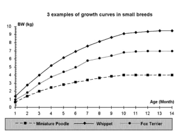 It is often considered that growth in small breed dogs is completed from 10 to 12 months of age. At that age, one will opt for an adult food for small dogs. Too often, a small breed adult dog continues to be fed like a puppy, which is a nutritional aberration: puppy foods are generally too rich in fat, in protein, and in calcium to stand as an optimum answer for an adult dog in the long term.
